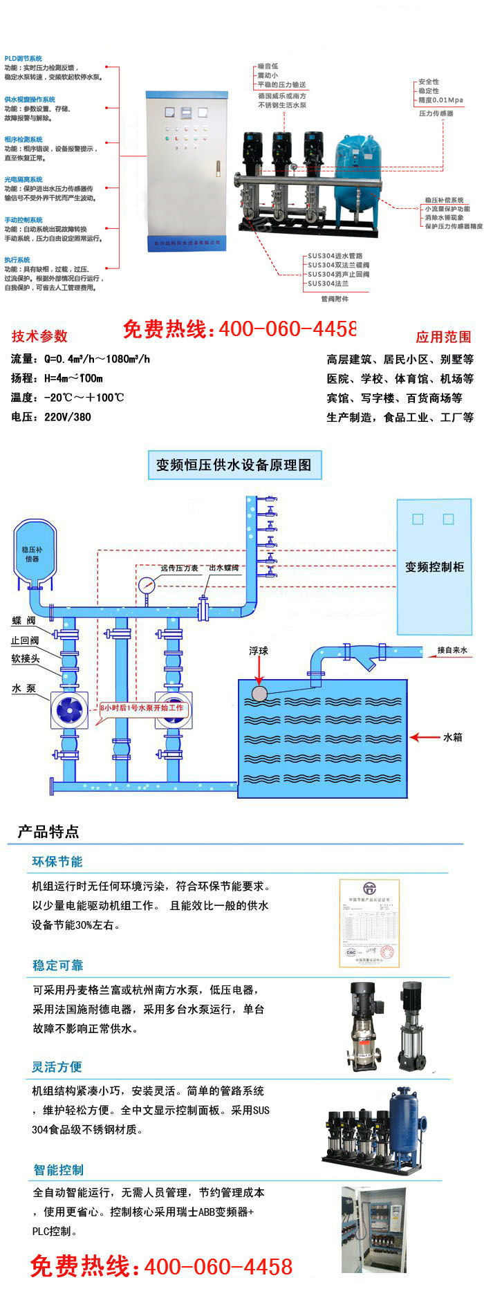 還可根據設備外觀以及工作原理,對恒壓變頻供水設備的產品優勢特點進行概述:外形美觀、結構緊湊、高度智能化、節約能源、操作及其簡單以及友好人機界面等優點,呈現高端大氣之感。